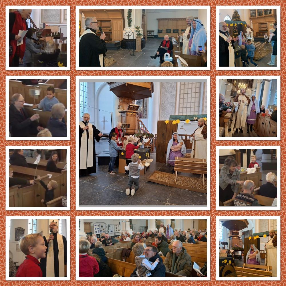 Kerstmorgen vierden we samen in de kerk: kinderen, ouders, grootouders, de gemeenteleden, belangstellenden... alle kerkgangers konden de stal bewonderen die een dag van te voren met de kinderen was gemaakt. Aan het begin van de dienst werd de stal compleet met Jozef, Maria en Jezus. De dominee ging in gesprek met de kinderen. Al snel bleek dat ze de dieren in de kerkbanken konden vinden en ze gingen op zoek, geholpen door de mensen in de kerk. Een vrolijk en feestelijk begin van de dienst!